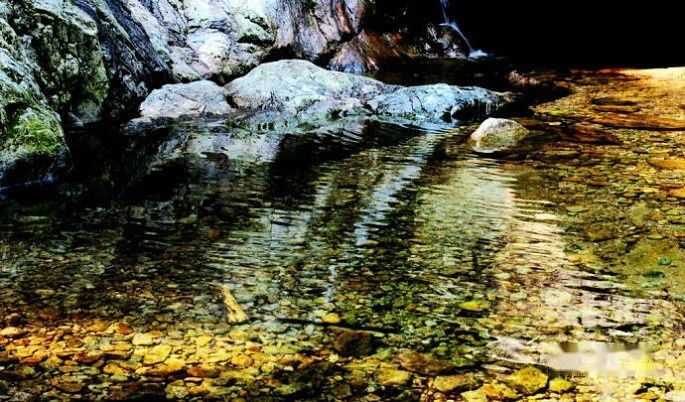 追梦谷以“水秀山奇,流泉飞瀑,溪浅潭深,怪石幽谷”而著称。不过,因为是枯水期,进得谷来,并不见激流湍湍,响瀑飞泄。我们在谷中前行的时候,干脆不走石阶,就沿着露在谷底的大大小小的石块崎岖而行。反而看到了水的静、净、幽、柔之美。谷底有很多游玩的女孩子蹲在水边捧水嬉鱼,水像是嵌在石缝间的翠玉,鱼就是玉里细细的纹络。因为水太清,不仔细看是看不到那些游动的纹络的。