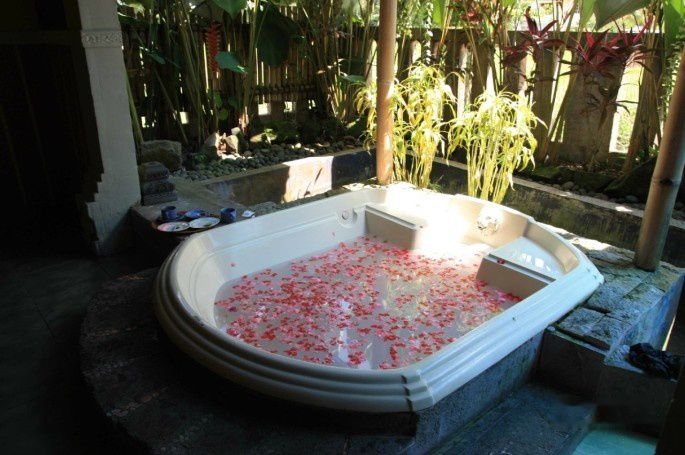 吃完饭,我们来到了VERONA SPA。这里是位于大片稻田的最里面,可能因为不靠街,所以也被网友认为是价格最公道最具性价比的地方吧。不过一进去问价格,比我在网上看到的高出许多,最后选择了2.5小时的套餐,包括按摩,牛奶浴和去死皮。我们来到了这家店最好的一间房,是一个双人间,面对这宽阔的稻田,里面有一个双人大浴缸。躺在里面可以欣赏稻田的风光。浴缸前面种着大颗的美人蕉,这样把鱼缸和外面的稻田分割开,保护了私密性。