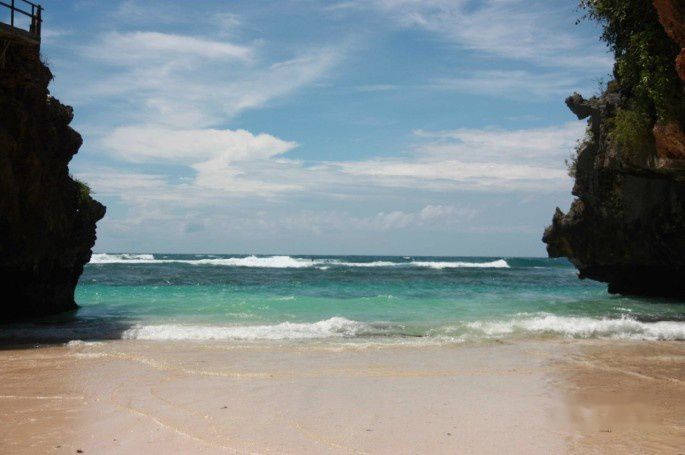 第四站蓝点,其实离乌鲁瓦图很近的。大概十几分钟的车程。到了以后,我们就顺着阶梯下到最下面。在一片被两块岩石夹在中间的一片狭小的沙滩上,看到有人冲浪的。这边风很大,沙子很白,适合拍照。只可惜我们想进蓝点酒店拍照,不过没有让我们进去。不知道是不是一定要花钱喝东西才可以呢?