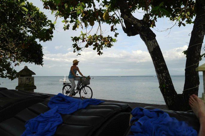 这个酒店挨着海边,我们订的是海边小别墅,是一个套间,还有私密的小花园。从屋子里走出去,几步就到了海边。去靠海的餐厅领了欢迎饮料以后,我们来到海边有皮和藤制成的躺椅。我们过去的时候,服务员就送过来毛巾。躺下以后,望着头顶的蓝天白云,眼前的海面,听着小鸟的叫声,喝着饮料,心情真的舒服极了,心想就这样呆上一天也行啊。