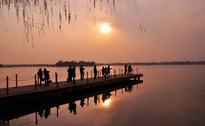 到颐和园的时候已经三点多了,可能是周五的缘故,那里人特别多,跟着个老年团走走停停,不然很容易迷路,后来发现有人拿了张手绘的《走进颐和园》地图(就是鼓浪屿那种),不知道哪儿买的。走过世界上最长的长廊,在昆明湖逛了一圈,被骗上了龙舟开了5分钟来到了十七孔桥,那座桥还是很不错的说。然后很无聊的准备出去,结果被告知那里是新建宫门没有去王府井的车,要走到东门。于是又在里面走了一圈,想不到最惊喜地事发生了:终于看到了昆明湖上的日落,太美了!