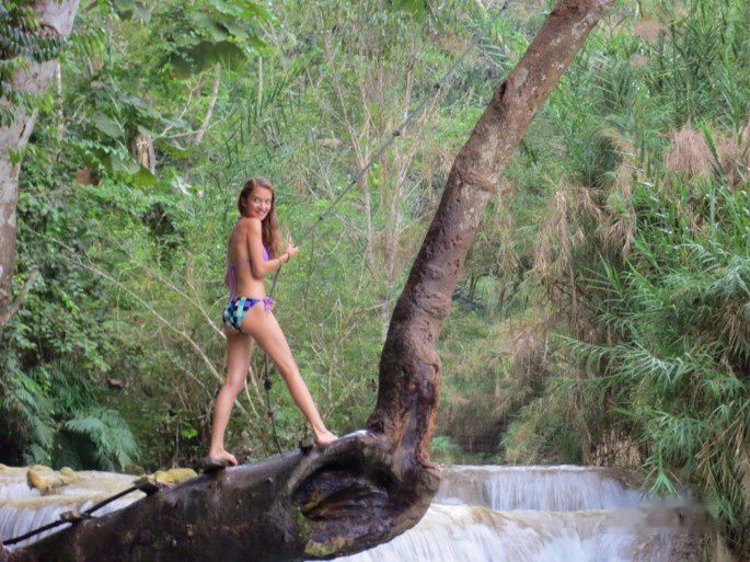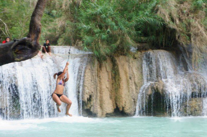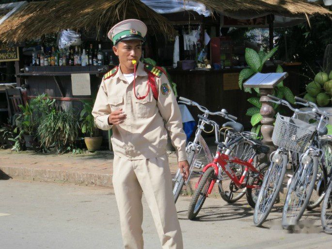 白天,我们拾级而上328步到达普西山顶,一览琅勃拉邦两江夹持、群山环绕的美景;我们手举着两三块钱一瓶的啤酒,坐着小竹筏在湄公河上慢漂,漂到一片绿荫下享用午餐;我们到达观西瀑布游览,坐在瀑布下方的池塘边上观赏美女帅哥的跳水表演;我租辆自行车,骑行游览琅勃拉邦古城,欣赏异国他乡的风土人情,人文景观。