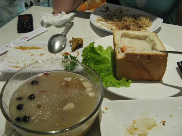D3晚饭:西单大悦城的龙心大悦台湾小吃。我点了个棺材板,四方形的面包,里面空心,放了海鲜浓汤,很好吃的。豆沙冰也很好喝,还有其他几样小吃,忘了名字。总之,台湾小吃我还是比较爱的。