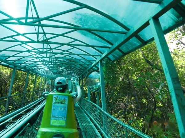 面前有两条路,赶紧下山,想也没想,就走了另外一条路,忘了导游的一句话,原路返回。。。噩梦即将开始,起初浑然不觉,只觉得人一下少起来了,可能是晚了吧,我们已经习惯了不耻最后。再走着,发现不对劲,怎么下山途中还有很高的上山坡呀,上到坡顶,又马上很陡的下来,太恐怖了。每走一步,我都用尽全身力气,扶着栏杆,生怕滑下去或栽下去。怎么这么危险,没有工作人员呢,到底什么时候才能到滑车的地方呀。正思寻着,回头一望,咦,遥远的山那边,那蓝色顶棚不就是滑车吗?糟了,走错路了。这下进退两难,打死我也不要回去了。往前,前途未卜。问了几个路人,情侣、军人、外国人,他们都建议不要回头了,已经快到出口了。好吧,带着复杂的心情下了山。到了山下,拽着那张没用掉的滑车票,动足脑筋。要么转让吧,都快关门了,谁还上山呢。要么退吧,售出的能退吗,中国一向是离柜概不负责的。这里要感谢燕子,虽然她不看好退票的想法,但还是贯彻执行了。善良的表情,美丽的谎言,居然真把票给退了。虽然区区30元,但成功的感觉远远超出登上好汉坡的喜悦。说来,不知道有没有爬错坡,怎么坡上既没有题字,也没有立碑,只见得一堆人在拍照留念。