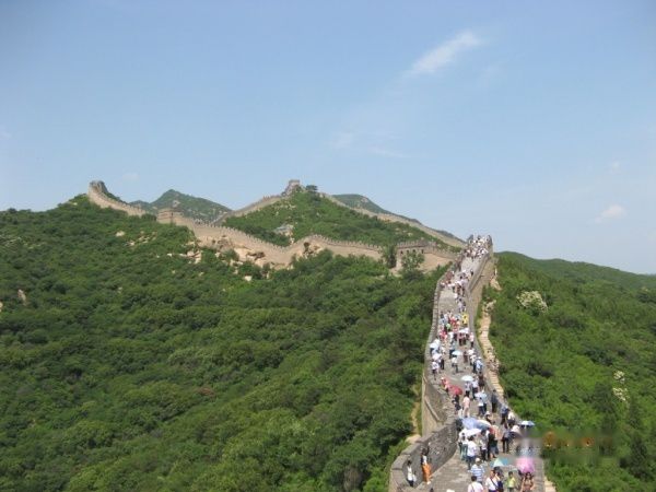 八达岭有好几个停车场,导游要我们记住我们是在前山。买了门票,半价20,双程滑车票60,一共80。滑车距离实在太短,觉得票价不值。到了滑车口(北四坡),目标是北八坡,即好汉坡。长城入口是个熊乐园。路上真的很多人,又晒又热。虽然风景很好,但爬得够累的。走走停停,再拍拍照,到了顶上发现已经快4点了。