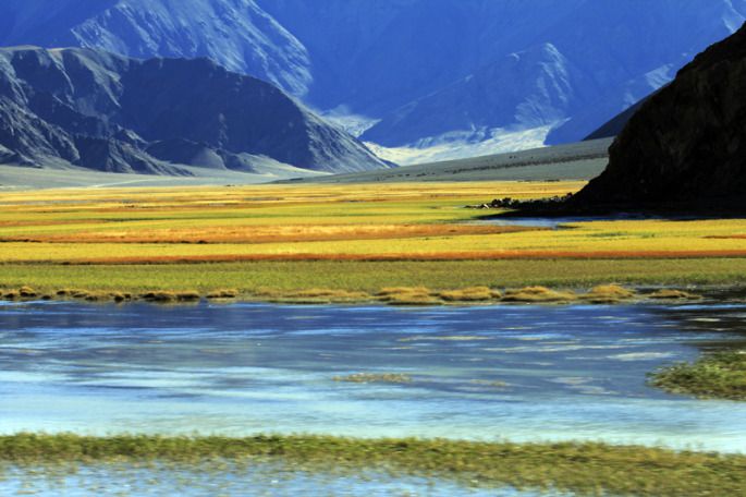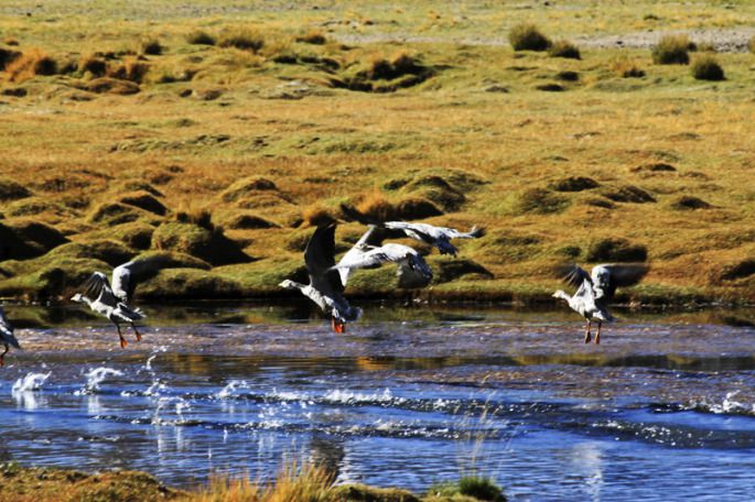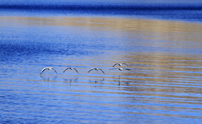 阳光下湿地里的草泛着金黄色的光,草地里的流水映着天空的蓝色,斑头雁就像白色的精灵,实在好看,忍不住总想再靠近一些,结果惊飞了湿地里的鸟儿,望着远去的鸟儿继续赶路。