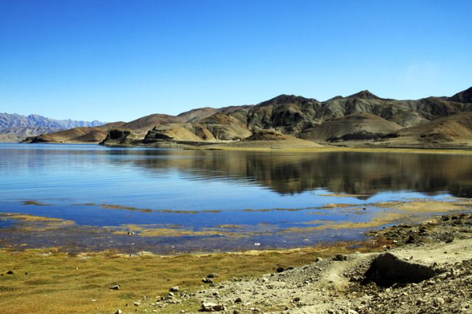 斑公错的水还是一如既往的美,除了湖边受施工影响略显浑浊外,湖中的水还是很清澈的。湖边的山在对水梳妆,倒影很漂亮。但水鸟却很少见到,应为道路施工打破了它们宁静的生活环境。