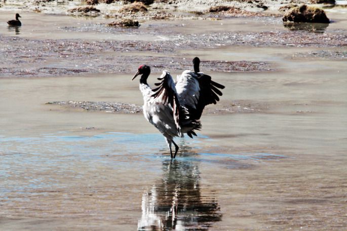 此行不能说没有收获,黑颈鹤给了我最大的惊喜,返回狮泉河的路上我们又邂逅了黑颈鹤,阿里的黑颈鹤似乎更不怕人,它们在那里优雅的踱步,而且是向着我们这里,最后两只黑颈鹤竟翩翩起舞,那舞姿优美极了。