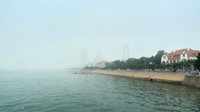 我们夫妇二人沿着海滨慢慢溜达,青岛的大雾依然如故,走在海边,远方的高层建筑仿佛悬空的一样,一会像海市蜃楼,一会又不见了身影。
