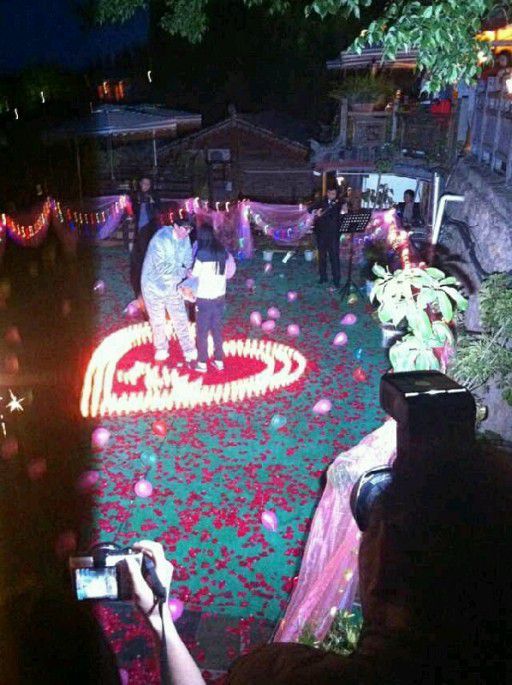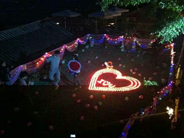 大家都开始跟着兴奋起来,玫瑰,蜡烛,粉色纱幔给阅古楼这座古老的纳西民居添了丝现代的浪漫气息。