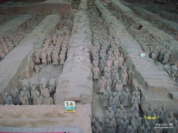 导游的讲解:一号坑为东西向的长方形坑,长230米,宽62米,四周各有五个门道。坑东西两端有长廊,南北两侧各有一边廊,中间为九条东西向过洞,过洞之间以夯土墙间隔。这个坑以车兵为主体,车、步兵成矩形联合编队。军阵主体面向东,在南、北、西边廊中各有一排武士面向外,担任护翼和后卫;东面三排武士为先锋。九个过洞内排列着战车与步兵的庞大主体军阵,每个过洞内有四列武士,有的穿战袍,有的着铠甲,中间配有战车,每辆战车后有驭手一名,车士两名。由于一号坑内进过水,在建成后不久就把土隔梁的下部泡软而导致局部塌陷,现在隔墙比陶俑低就是这个原因造成的。