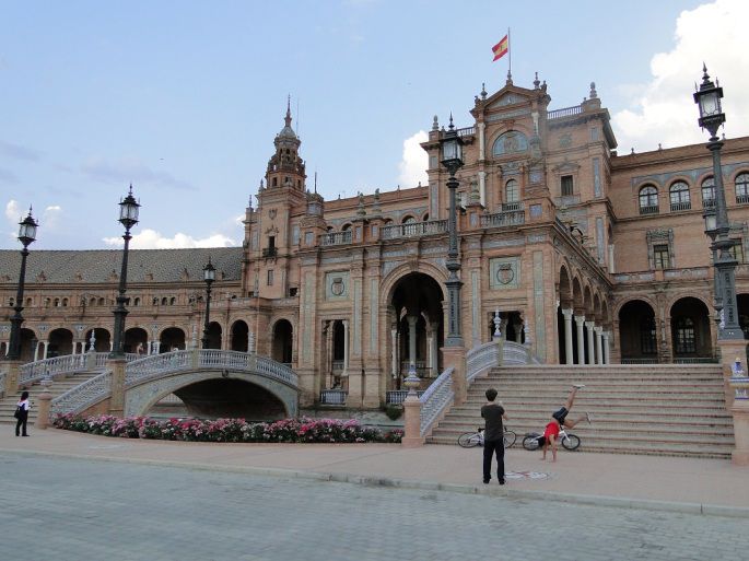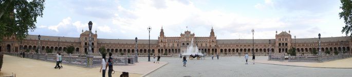 西班牙最大的西班牙广场是我们认为的最大看点,也是这座城市的骄傲,整个广场由一组主体建筑和一些辅建筑围成巨大的圆形,中间是宫殿式建筑,一面猎猎飘扬的西班牙国旗更让人对这里产生敬意; 楼前高高的台阶象征权力和威严,左右各一的跨河拱桥小巧玲珑; 跨度非常大的建筑两旁分别是一个细高的塔楼,像两位美丽的姑娘默默地作伴。 整个建筑以瓷砖和马赛克作为材料,高贵的淡紫色是其主色调,清丽典雅和谐,地面有各种马赛克铺就的图案,具有某种象征意义,据说和西班牙的各个州有关。