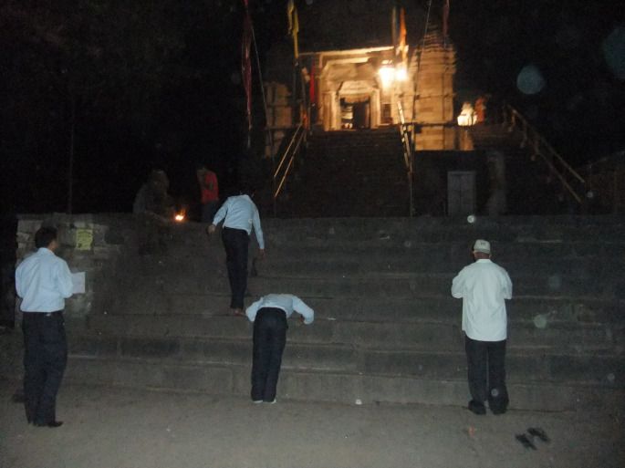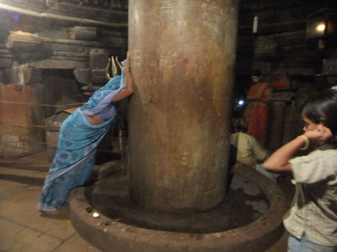 又看到庙里有灯火,就想知道里面是怎么回事, 便进去了 。原来是信徒在拜林迦。每个进去的人都会绕着这中间供奉的巨大的林迦走一圈,有的人则会抚摸和亲吻它,而这个妇女这样趴了不知有多长时间,因为从我进去就看她趴在那,我在里面呆了五六分钟,直到我出来,还没有见她要动的意思,我想她一定在虔诚地求神保佑她什么吧: