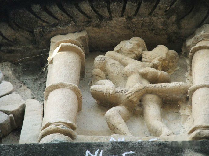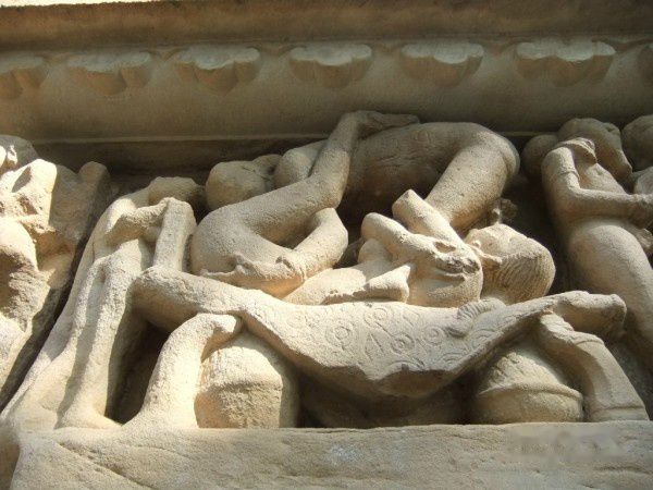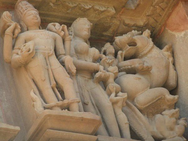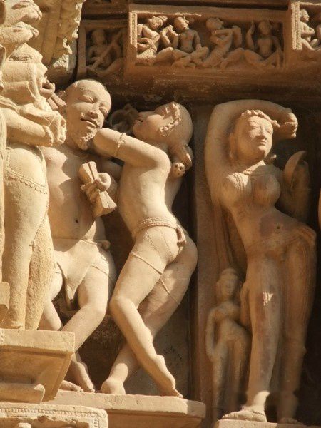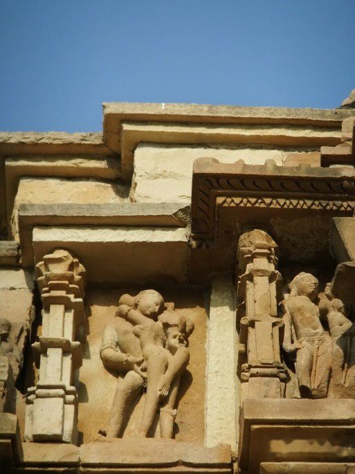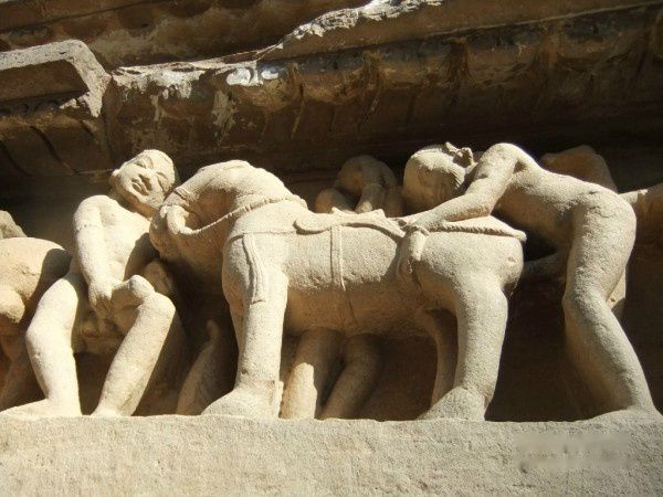 早就听说西庙群也被称为“性庙”,说它的外墙上雕满了性爱的各种姿势,但真到了这里,并非如传说那样,其实它的绝大部分雕刻表现的还都是各种生活场景和神兽人的各种姿势,猛地看去还真看不到性爱的雕刻。很多游客都是在导游的激光笔下才发现的,我看见的第一组性爱就是靠一个导游的指点。就是下面这幅