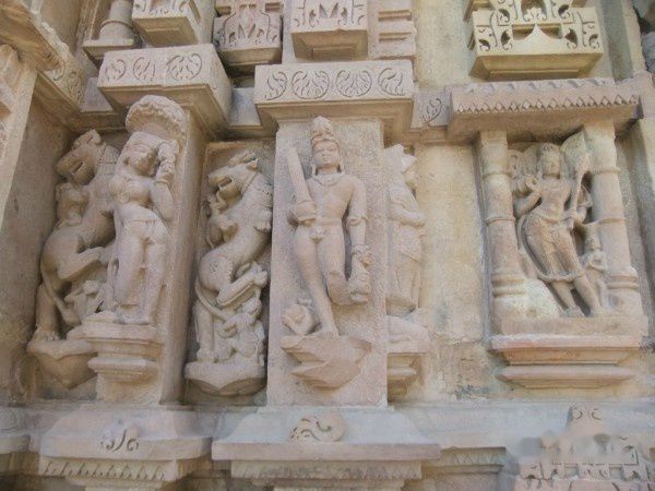 东庙群属于耆那教(Jain),距离西庙群1.5公里,同为世界文化遗产,但规模较小,只完整地保存着少数几座神庙,更多的是散布的神庙废墟遗迹。与西庙群琳琅满目的性爱雕塑不同,东庙群主要为耆那教建筑,虽也同样布满雕刻,却是雕刻着印度三大主神:梵天、毗湿奴和湿婆的形象,还有他们的老婆,以及各种化身。
