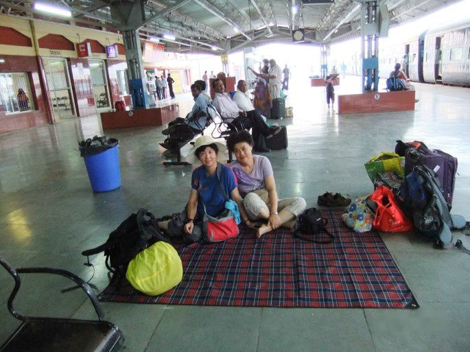 回到住处,自己煮了挂面。吃完又托买机票的代理买好去阿格拉的火车票(老年人317卢比,成年人753卢比)。下午4:45,旅馆派嘟嘟车送我们去克久拉霍火车站(85卢比/辆)