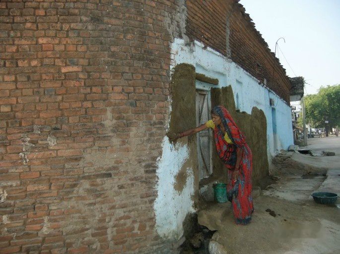 因为还早,村里人不多,一个妇女在用牛粪涂墙