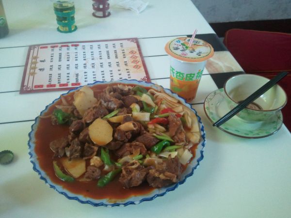 回宾馆的路上,朱师傅推荐了吃午餐的地方,就在党校宾馆正对面,很多当地人经常去吃,非常地道。不知是饿了还是真的好吃,反正红焖羊肉让我垂涎。朱师傅还介绍了2种水果甜瓜和李子,吃完饭买了些,不起眼的水果,可是那叫一个甜啊。