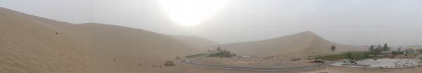 下午在宾馆里午休,吃水果。突然发现变天了,刮起大风,这可是我们不愿意看到的啊,约好的五点半去鸣沙山月牙泉,如果下雨就得改行程。到五点半,还好没下雨,但是天阴刮风,看日落的希望破灭,拍照的效果也大打折扣。在去鸣沙山的路上还顺便去了雷音寺,小寺院很精致,莲花香炉非常著名,有很久远的历史了。