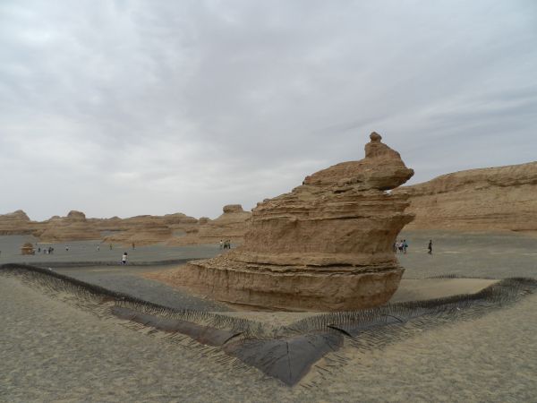 D3:8月4日,早8点准时出发去雅丹及一路景点。今天仍是多云到阴的天,防晒省了,倒要防风防沙。路过玉门关必须买票,40元/人,过路费吧,不过这40元包括了玉门关、汉长城和河仓城三个景点,只是河仓城已经倒塌不能看了,我们决定先去雅丹,回来再看那2个景点。2个小时到达雅丹大门,换乘景区大巴一路观光,要求必须一路都要跟着这辆车,不允许自己步行。一共停靠4个景点,前2个只给5-10分钟拍照时间,第3个约40分钟,第4个也是10分钟,太不靠谱。整个一圈下来大概2小时左右吧,观光时间严重不足,比较遗憾。更遗憾的是,在第3个景点有包越野车去雅丹更深的南边,400-600元/车,但车太少,等了半天也没坐上,就算了。出来约12点,实在不尽兴,又在门口兜了一会儿,依依不舍离去。