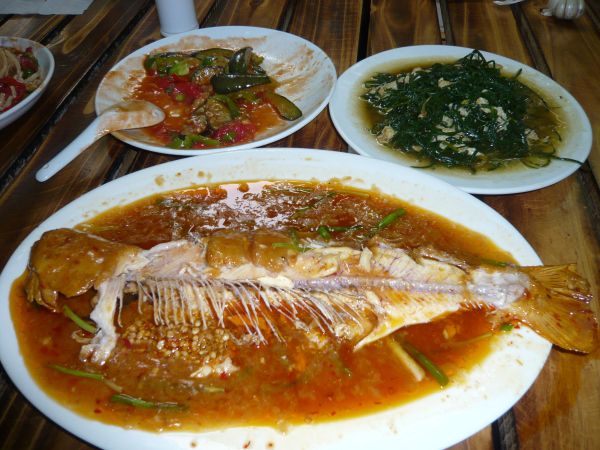 之后,准备驱车前往较远的阳关。朱师傅本不想去,太远且路况不好,很辛苦,但经不住我们一再请求,还是去了。大约一个小时朱师傅把我们拉到了阳关附近的葡萄园农家乐,坐下来先把午餐补上,红烧金鳟鱼128元/条,沙葱炒蛋40元/盘,分量足得很,味道好极了,就是价格有点坑爹,不过旅游中难免嘛,人家也是明码标价,愿打愿挨,见怪不怪啦。沙葱很少见,可不是哪里都能吃得着的呀,值了。个人建议,本着节约时间节约开支的原则,这顿午餐完全可以自带干粮,路上解决,没必要吃这农家乐。当然,如果想尝尝这里的特色菜,那就另当别论了。吃完才想起来拍照,所以鱼都成那样了。