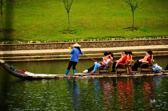 竹筏划到这里也放慢了脚步,让远道而来的游客尽情欣赏这一幅绝美的画作。