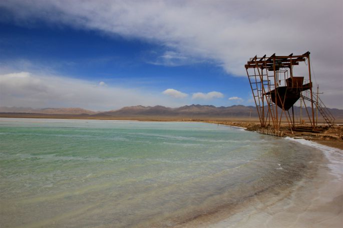 茶卡湖内的盐几乎无穷无尽,因为雨水会将更多的盐从周围的山上带下。这是一个盐的世界,车上、地上、甚至空气里都有盐味,远处有挖盐船在挖盐;近看这些盐,是像水晶状的晶体;尝一尝,味道与食盐略有不同。在此既可观赏盐湖的风光,又可参观机械化采盐作业。通向湖心区的小火车是深受游客欢迎的乘载工具。参观完茶卡盐湖我们一路向东返回,中午到了黑马河镇找了一家清真的饭馆吃午饭了,点了这里的炕锅羊肉一份98元,和炮仗面每碗12元,味道还不错,量很大,午餐3人共计134元。吃完午餐我们继续向青海湖151倒淌河行驶。