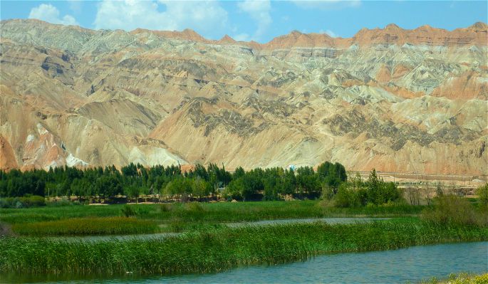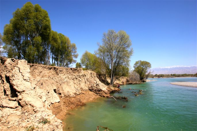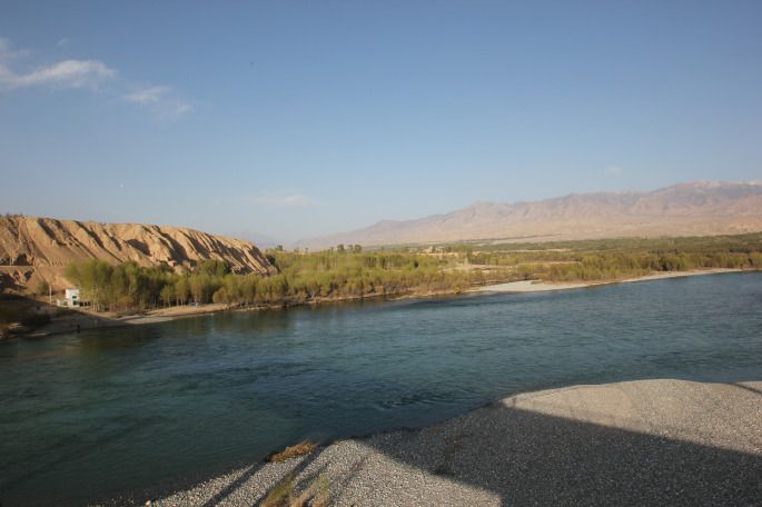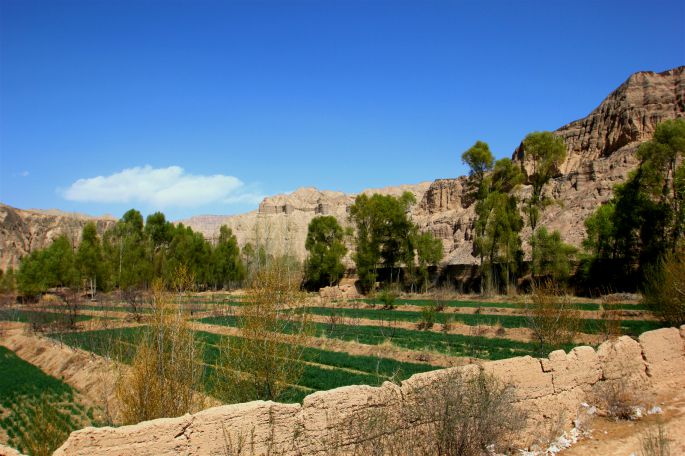 下午经过一些有点类似科罗拉多大峡谷的地方去了‘天下黄河贵德清‘的贵德. 碧绿的黄河呀, 根本不是‘黄‘河! 这一天的天气也非常好,我们特别开心! 下午的行程一路都是风景了,真的非常好. 这一路我们拍了不少风景照片,到了贵德县城已是下午5点多了,武师傅推荐我们去一家叫“三一园”的农家院吃晚餐,到了农家院看到吃饭的人很多,园子很大,园子内外周边有很多棵梨树,此时真是梨花绽开的季节,在这种庭院式优美环境中享用着晚餐,那时的感觉非常好,武师傅推荐了当地的特色小吃 狗浇尿 一种吃起来很 脆 甜 香的烙饼,味道很不错,还有当地的土火锅,晚餐共计150元。 晚上我们住宿到了贵德的温泉宾馆三星的,标间160元,据说旺季标间380元。