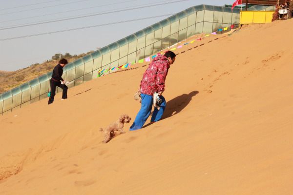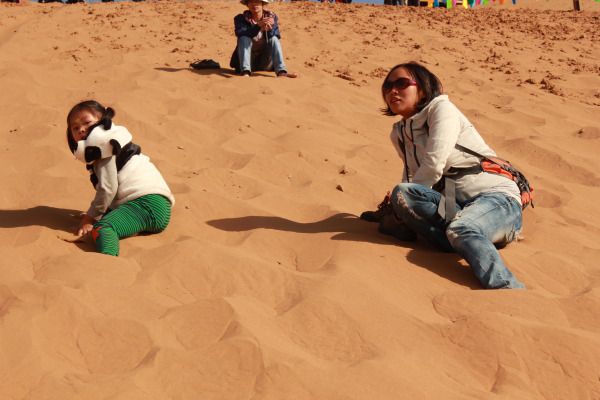 进门左边右边都是买票的,玩漂流和电瓶车。因为去的有点早觉得蛮冷。于是决定走进去。一路说说笑笑路过了坐快艇的地没去,直奔沙坡去了,沙坡头的沙颜色比鸣沙山的深,我告诉多多洛这个是金沙,鸣沙山属于银沙呵呵,(瞎说)在沙坡下直接脱掉鞋袜,开始步行,途中遇见一穿熊猫装的小妹妹手脚并用奋勇前进,于是开始逗小姑娘,和她一起手脚并用前行