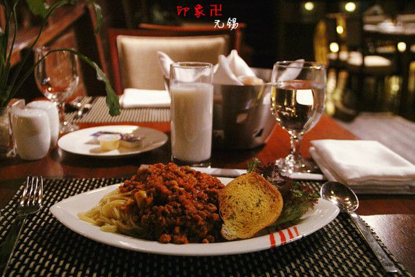 晚上下到酒店的二层吃晚饭。 整个酒店和餐厅都与禅文化有关,餐厅也被设计成船的形状,很有特色。 点了份肉酱意粉,还送餐前餐包。