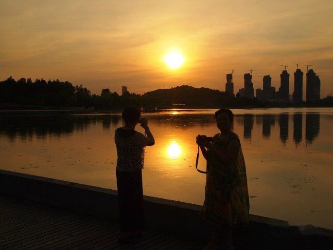 有朋友远道而来,我们相约重逢古琴台。7月骄阳似火,虽已到下午5:30分,夕阳仍似烈焰,热浪滚滚,月湖这块武汉人休闲的绿洲,也不例外。 好友相聚琴台,哪顾灼热气温大汗淋淋,依然游兴不减。