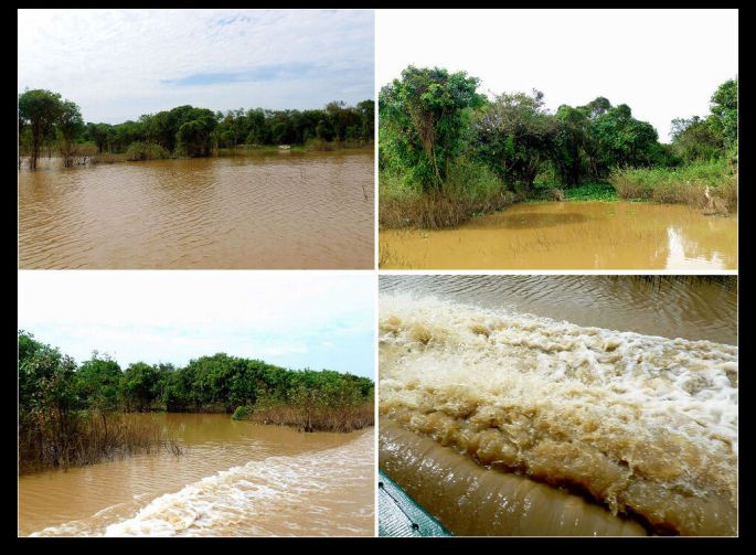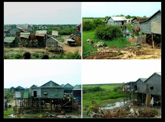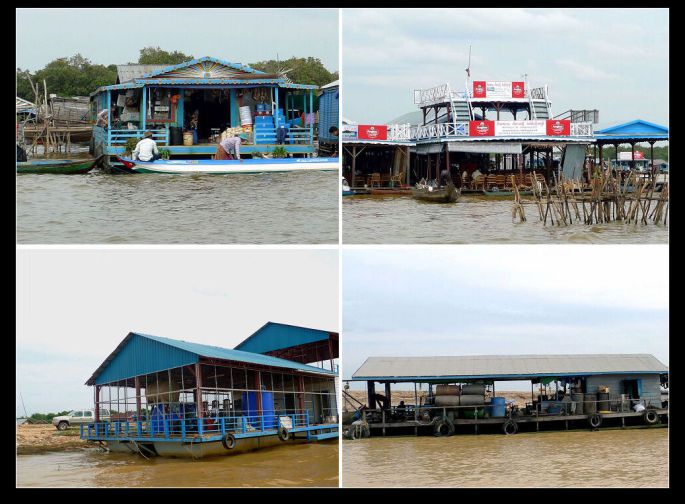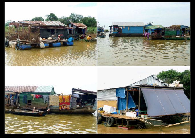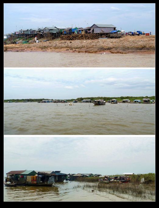 到了洞里萨就更糟糕了。水里岸边到处是用木板、铁皮、茅草、塑料布等乱七八糟东西搭建的参差不齐高矮错落的吊脚房,这就是居住着大批没有身份的越南难民的“水上浮村”。