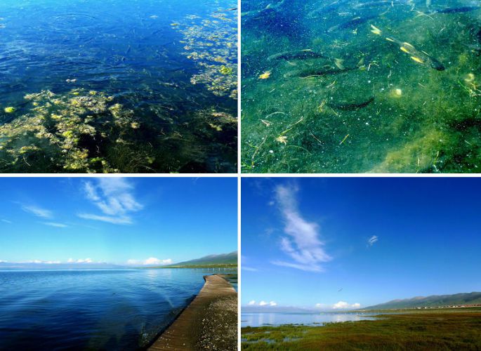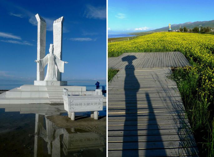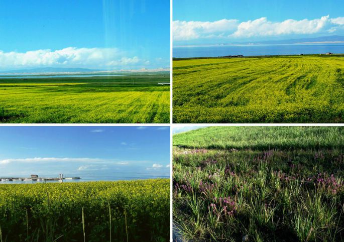 车窗外,黄土高原和青藏高原交汇的景色苍凉而粗犷,渐渐地,在大家的惊呼声中,青海湖初露端倪。被四座高山环抱着的一泓烟波浩渺的湖水在蓝天、白云、青山、绿草、紫花、黄沙和金灿灿的油菜田的映衬下一碧万顷,如同镶嵌在高山、草原之间的蓝宝石,草原的优美、海的浩瀚与湖的沉静交织在一起,成就了青海湖的博大之美,美得让人不自觉的颤抖。每个人看到这景致,无不为之倾倒、动情。