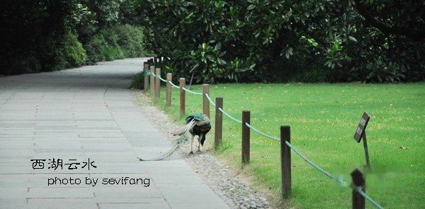 那天去花港景点,遇到一只不怕人的孔雀,在路边悠闲散步。