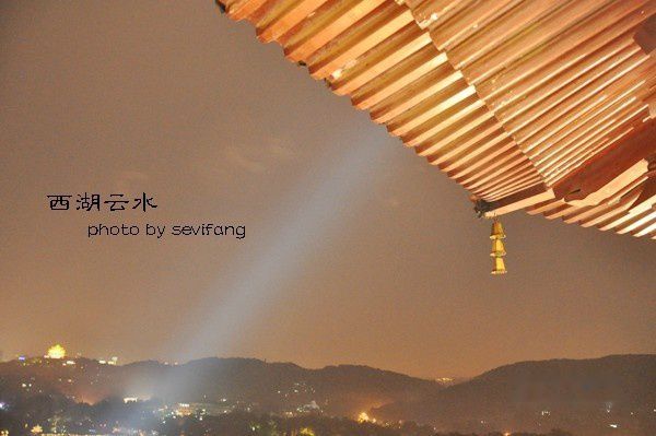 傍晚一场突如其来的暴雨,仓皇游览一圈,我们就遁入花港观鱼附近的知味观躲雨,顺便品尝传说中的西湖醋鱼。饭后发现这里公交非常不方便,于是去雷峰塔是生生地步行过去的。(又是用走的!)说是去看夕阳下的雷峰塔,其实我们走到塔下的时候已经华灯初上。不过夜晚也好,够安静,在灯光的映衬下,雷峰塔以及塔身后的西湖是另一种美