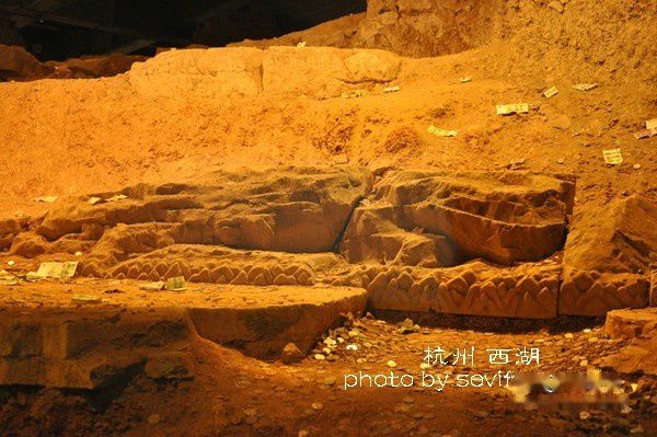 真正的雷锋塔早就在1924年9月25日的时候轰然倒塌(鲁迅的《论雷峰塔的倒掉》,记得吗?),新的雷峰塔是2002年建成。不过,新塔下面可以参观旧塔的残骸,也许从这些隐隐约约的山海雕塑,可以想象当年的盛景。