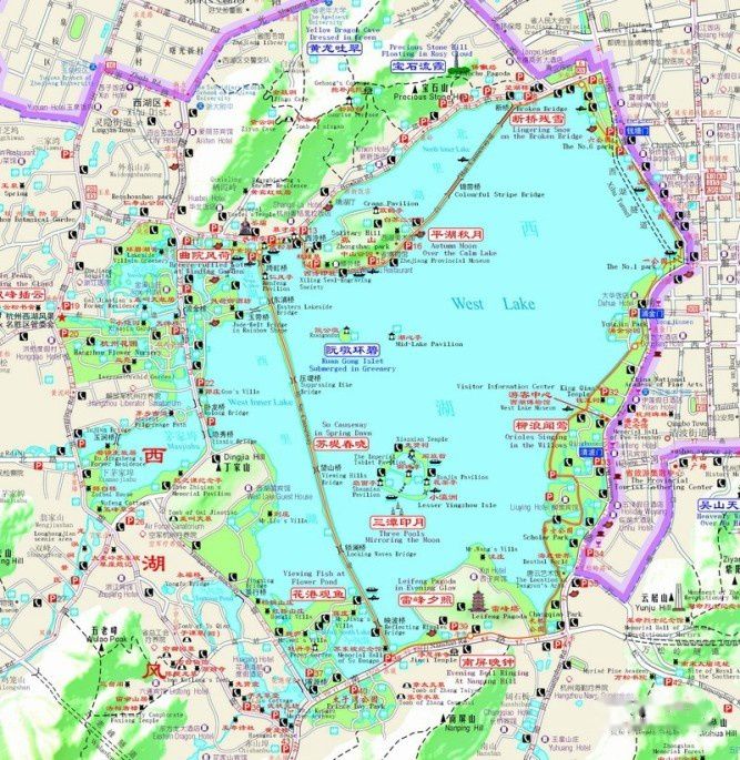 小时候背苏东坡的诗“欲把西湖比西子,浓妆淡抹总相宜”,未觉此句之妙。直到自己看过秋天的西湖,再对照夏季的西湖,开始有点明白西湖季节转换之妙。山水是宋代画家最擅长的题材,按北宋的传统,山水画作都必须有简洁,但又一语中的的题目。于是,在马远等画家的画卷上,就出现了南屏晚钟,双峰插云等题名,也就是最初西湖十景的由来。而我们那几天游览的顺序,几乎也是按着西湖十景(下面地图中的红色标注部分),按图索骥。