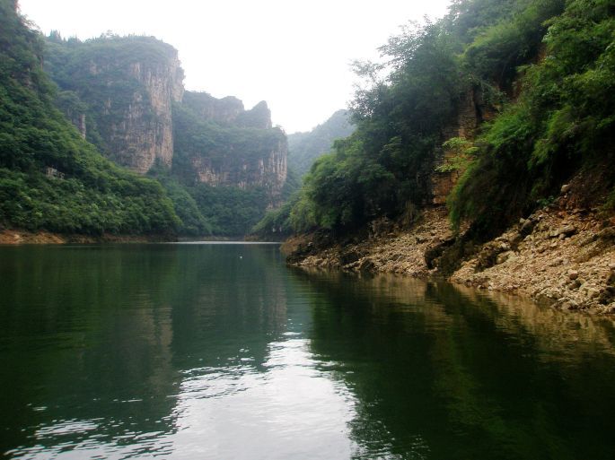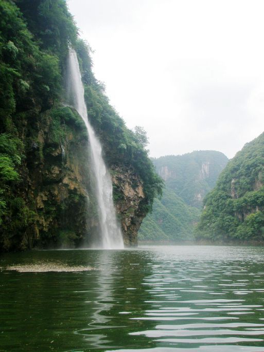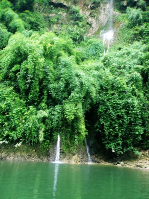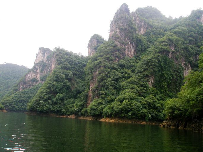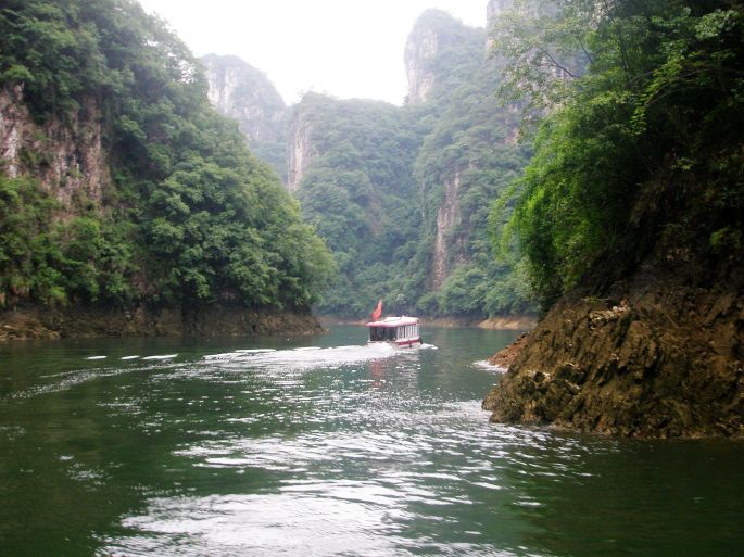 游船在山水间行进着,沿途处处皆景,碧水丹山。山间不时可见喷泉流自河中,姿态万千。一个个令人目不暇接的景象,舒展平缓地在展现在眼前。湖的青幽、山的纯美,构成了一幅天然的艺术长廊。