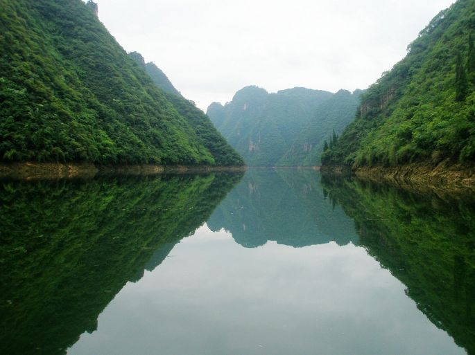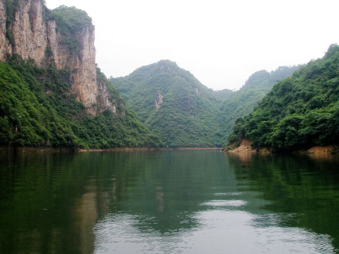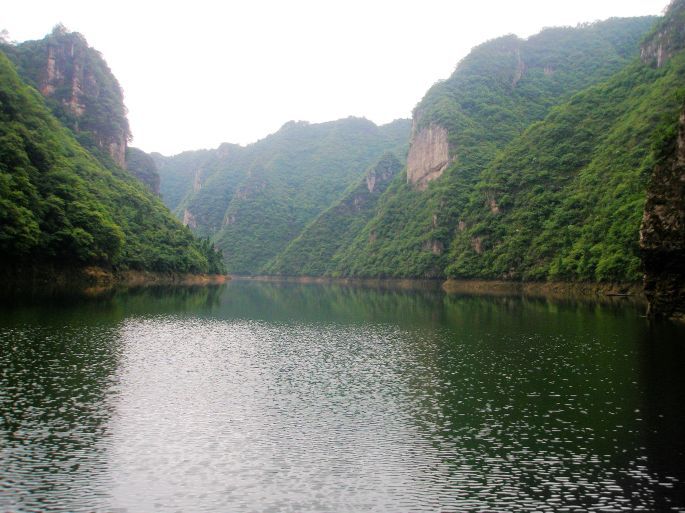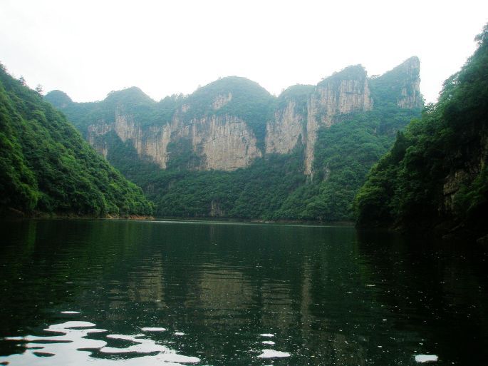 刚刚下过大雨,舞阳河上,天空虽依然灰蒙蒙,空气却异常清新,山间浓绿的植被丰富而茂盛,恰似天然氧吧。深吸了几口这难得的好空气,顿觉神清气爽,精神振奋,心情格外地愉快。