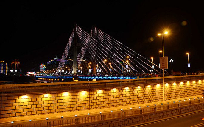松花江两岸的华灯初放,不知是灯光点缀了夜色,还是夜色渲染了灯光,这和谐的美丽竟让人心醉神迷.江水已经沉浸在浓重的夜色之中,丰满而袒露的胸怀正在均匀地呼吸着,江堤两岸的华灯倒映在宁静的江面上,无意间又给这本自美丽的江面镶嵌上了金色的花边。
