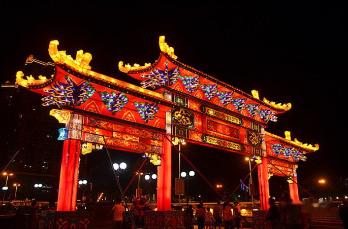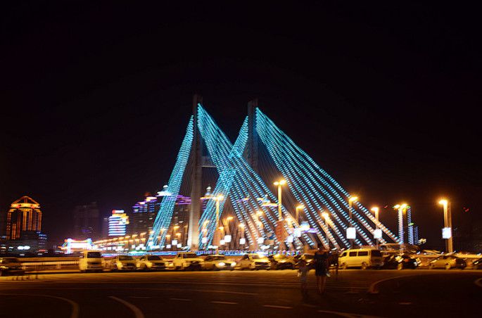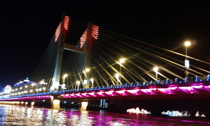 江对岸的高楼在彩灯的变换之中,尽显各自的风姿.横架南北的大桥好似一条金色的长龙,将它彩色的鳞甲辉映在藏青色的江面之上.人们散布在望不到边的江堤上.凉风送爽,江水渐长,乾隆码头,清兵塑像,在灯光的迷幻里,好像回到了松江?精美的“头道码头”河灯文化装点得牌楼,相得益彰。沿江地走出3KM,步移景换,广场相连,美哉吉林,胜过浦江。