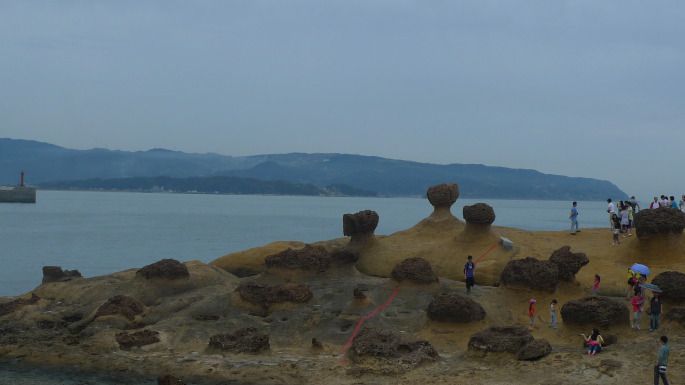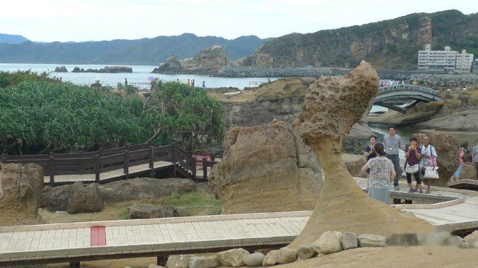 也许是我们昨天闹了一下,地陪的态度好转,本来想带我们去看的红珊瑚购物点也免了。上午去野柳风景区,著名的女王头就在这里。这里是看各种海水侵蚀的天然怪石,大海环绕,还可以远眺基隆港。
