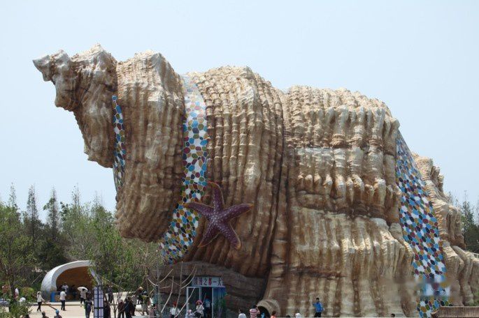 主建筑远远的看像是金属制作的,近看才知道,原来是用鲍鱼壳粘在外层形成的