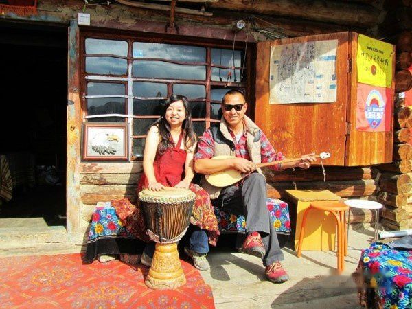 我们客栈的院子,看到躺椅和遮阳伞,老板的房间的门口放着非洲手鼓。换上花裙子跟老板说,能不能在非洲手鼓那里照张相,老板很慷慨的答应了,而且还抱着琴一起来照啦~~
