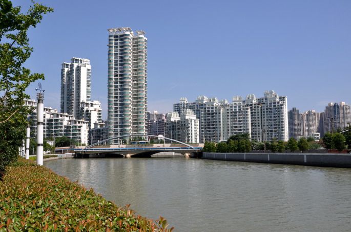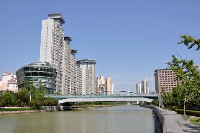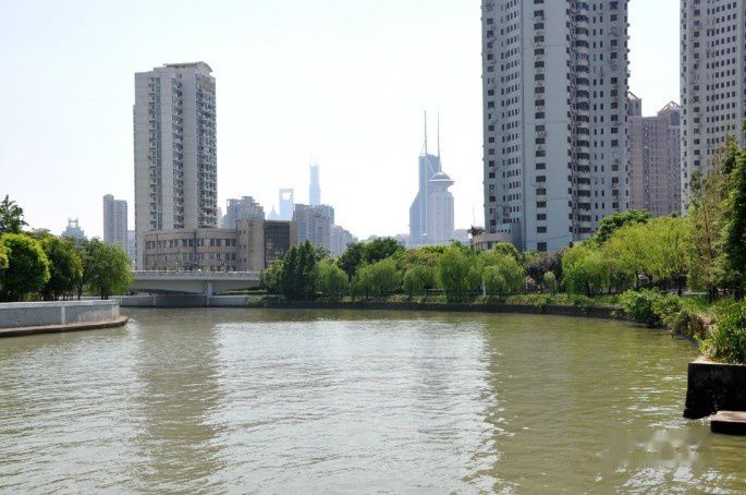 苏州河上普济桥,后景中的楼宇为“静安河滨花园”