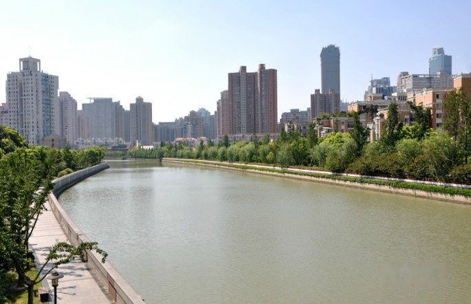 在苏州河静安和普陀两区分界河段上回望苏州河普陀段,图中桥梁为“长寿路桥”
