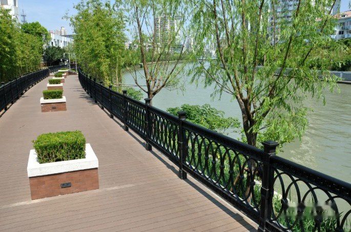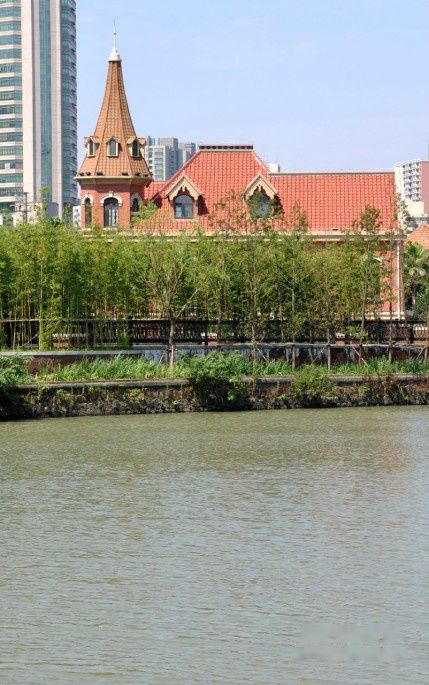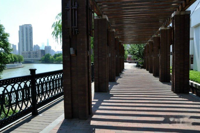 苏州河自西向东流经十八湾后,就出了普陀区地界,紧接下来,位于河流(西)南岸的是静安区,而(东)北岸则是闸北区的地面。虽然苏州河流经静安境内的岸线不到2公里,但在由泰兴路——康定东路——恒丰路桥围城的这块滨河区域内,目前建成了一座名为蝴蝶湾花园的亲水公园,这是一个面积达16000平方米的公共开放绿地,植物、木廊、亲水平台、广场、景墙、水池、动静结合、光影变幻,构成虚实对比的艺术景观。园内设置的免费开放体育设施还为附近居民提供了体育锻炼场所。此外,这边还巧妙地将市政污水泵站建在了绿地之下,从而打造了一个既富艺术感,又有完备市政功能的城市滨水新景观。
