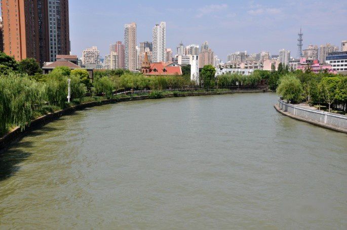 在普济桥上眺望“蝴蝶湾”,左岸是闸北,右岸是静安