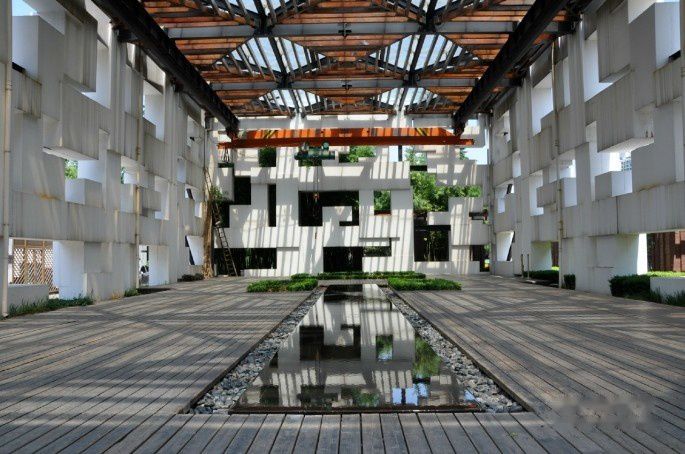 有雕塑感的解构模块艺术墙体包围下的污水泵站