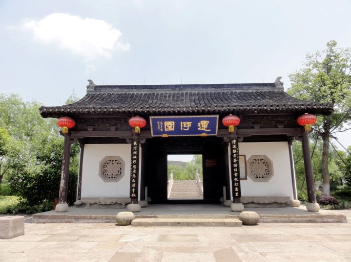 运河园大门,两边的石凳都雕刻有花纹均是古石凳。